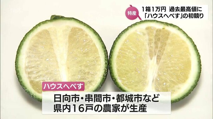 宮崎県日向市発祥の柑橘類「ハウスへべす」の初競りが宮崎市で行われ、1箱1万円の最高値がつきました。(武澤直穂記者)「日向生まれのこちらのへべす、きょうから出荷が始まります」ほかの柑橘に比べて皮が薄く、…