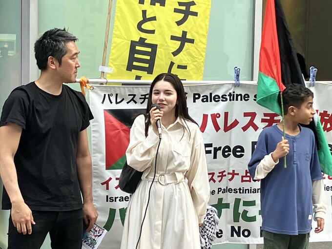 エルジャマル・アヤさん:みなさん、こんにちは。私は、両親がパレスチナ人で福岡市に住んでいますエルジャマル・アヤです。今日はみんなで、パレスチナの戦争が終わってみんなが平和に暮らせるように、一緒に呼びかけを頑張っていきましょう。