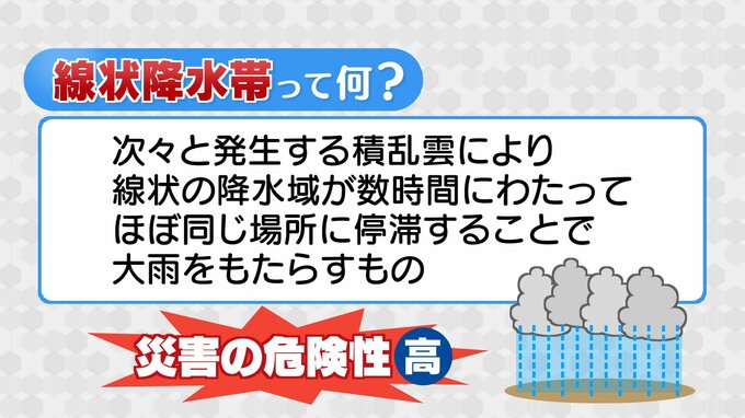 線状降水帯とは、次々と発生する積乱雲により、線状の降水域が数時間に渡ってほぼ同じ場所に停滞することで、大雨をもたらすものです。線状降水帯が発生すると災害が起きる危険性が高まります。