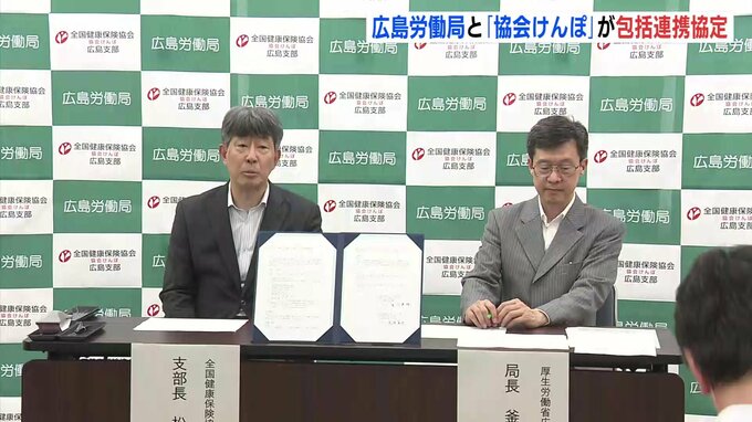 広島労働局と協会けんぽ(全国健康保険協会)広島支部は、働く人の健康づくりを推進しようと包括連携協定を締結しました。締結式では広島労働局の釜石局長と協会けんぽ広島支部の松原支部長が協定書に署名しました…