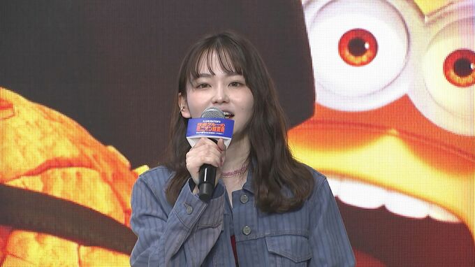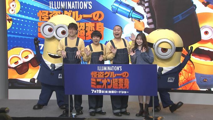 俳優の山田杏奈さんと、お笑いトリオ・ハナコの秋山寛貴さん、岡部大さん、菊田竜大さんが映画『怪盗グルーのミニオン超変身』“超吹替”新キャスト&“超宣伝”アンバサダー就任お披露目イベントに登場。
