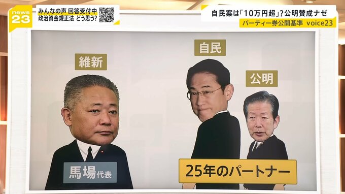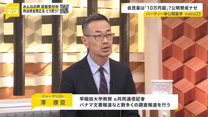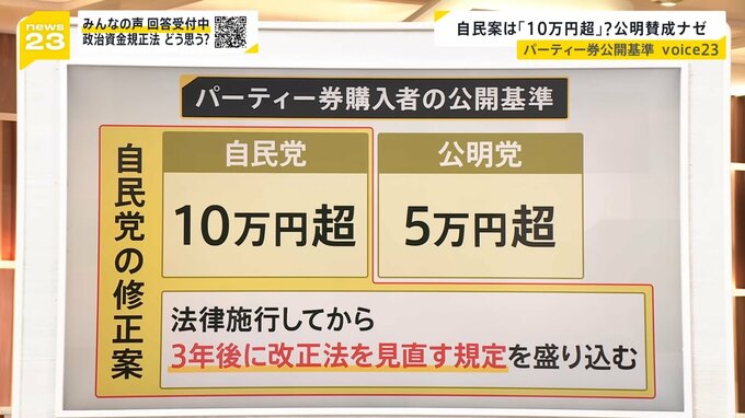 1つ目は、パーティー券購入者の公開基準で、現在の基準は20万円を超える額ですが、自民党は10万円を超える額を提案、公明党はより透明性を高めようと5万円を超える額まで引き下げを提案しています。