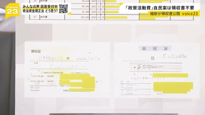 領収書でいうと28日に、日本維新の会は去年使った政策活動費の一部について、領収書で使い道を出してきました。