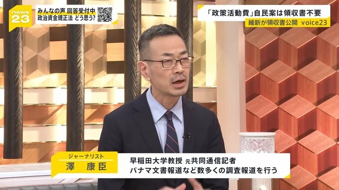 領収書なしでどうやって証明するんでしょうか。もともと“裏金”から始まった話ですよね。訳がわからないところで、お金が見えないところに行っていた。それを見えるようにすることは、一丁目一番地です。
