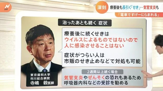 他の症状に関してはかなり治まったんですけど、せきだけは続いているということです。そうすると周りからの目もあります。「せき出てるけど本当に治ったの?うつさないよね?」など、本人もやはり精神的に追い詰められますので、他の人にうつさないのか心配であるということです。この辺りの部分について専門家に話を伺いました。