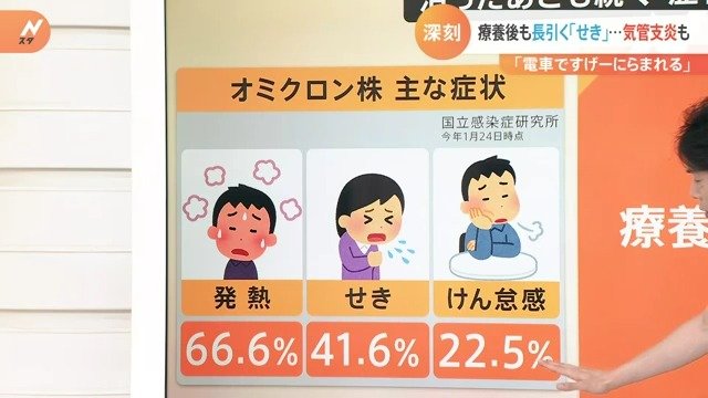 オミクロン株の主な症状として発熱、せき、けん怠感があり、こういったところから軽症者についてはインフルエンザに近くなってきたと言われていますが、せきについて、療養期間が終わった後もせきが出続ける、喉の痛みなども長引くという声も多くあります。