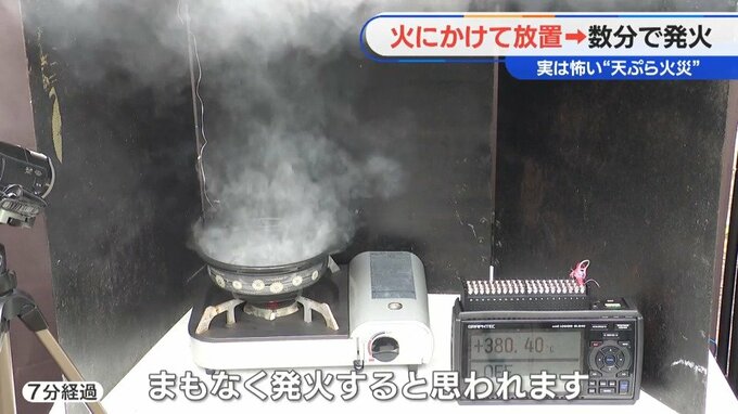 名古屋市消防局の再現実験で、天ぷら油が発火する過程を検証しました。