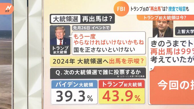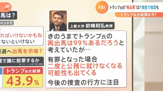 「きのう(8月7日)まで、トランプ氏の再出馬99%あるだろうと考えていたが…今回の家宅捜索で、有罪となった場合、二度と公務に就けなくなる可能性も出てくる。今後の捜査の行方に注目」