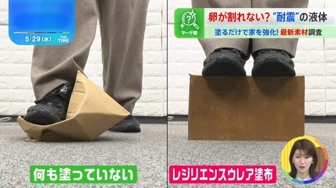 「何も塗っていない卵は割れて、レジリエンスウレアを塗った方はひびも入っていません!」