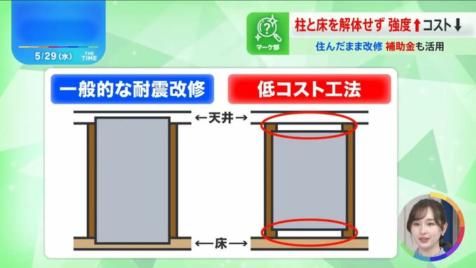 しかも、天井や床の解体がないので「費用も150~200万円ぐらいに抑えられる」と、低コスト工法の開発メンバーの一人、名古屋工業大学の井戸田教授は話します。