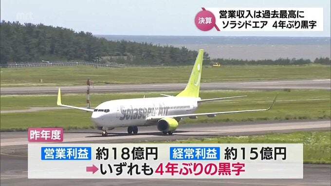 宮崎市に本社を置くソラシドエアの昨年度の決算は、過去最高の売上高を記録し、4年ぶりの黒字となりました。ソラシドエアの昨年度の売上高にあたる営業収入は、前の年度に比べ29%増加し、499億円余りと過去最高に…