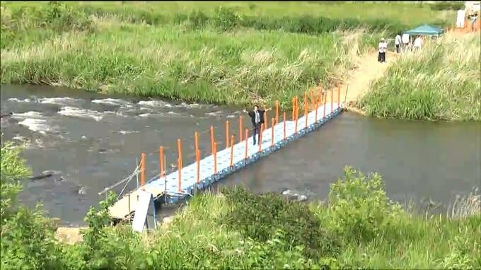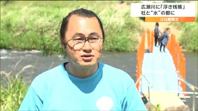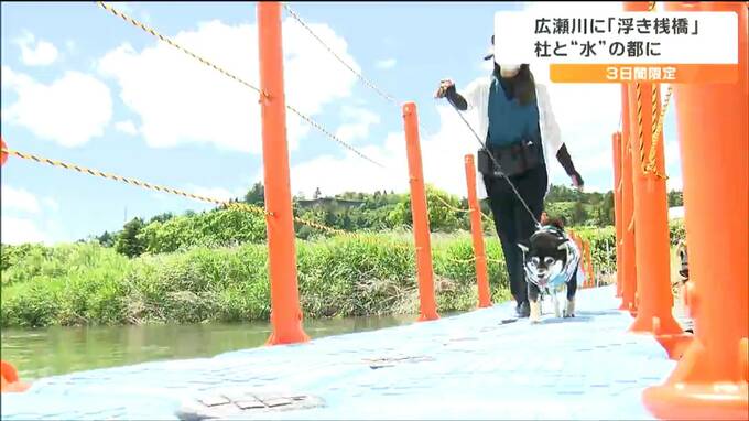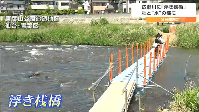 青葉山公園追廻地区の広瀬川に設置されたのは、長さ20メートルと15メートルの2つの浮き桟橋です。広瀬川をより身近に感じてもらうと共に、青葉山公園エリアの新たな散策路をつくろうと、仙台のまちづくりに取り組むNPO法人が企画しました。初日も、多くの人が訪れ、川の流れに揺られる橋を渡っていました。