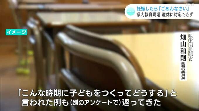 「『子どもができた(妊娠した)』という話があったとき、最初にその教員が言うのが『ごめんなさい』。『こんな時期に子どもを作ってどうする』と言われたという例も(別のアンケートで)返ってきた。周りも『おめでとう!とは言いたいけど…』という…。産休が喜ばれないような、それだけ忙しい、十分な対応ができていない職場になっているのは改善すべき」