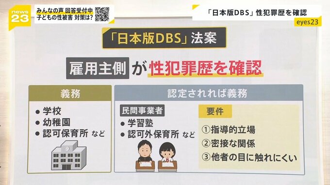 今、国会では「日本版DBS」の法案について審議されています。成立すると、子どもに接する仕事をする人の性犯罪歴を、雇用主側が確認することができるようになります。