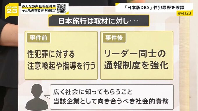 日本旅行も、事件前からボランティアスタッフに対して、性犯罪に対する注意喚起や指導は行っていました。事件後の再発防止としては、主にスタッフ同士で不正を見逃さないように通報制度を強化したと話しています。
