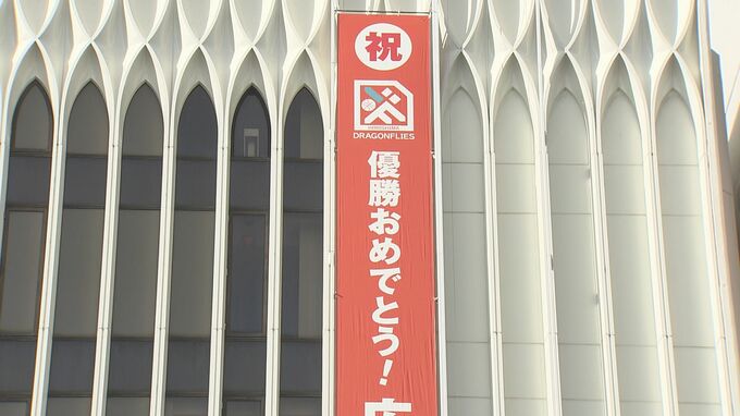 広島ドラゴンフライズのBリーグ優勝を祝って、広島市のデパートに懸垂幕が掲げられました。