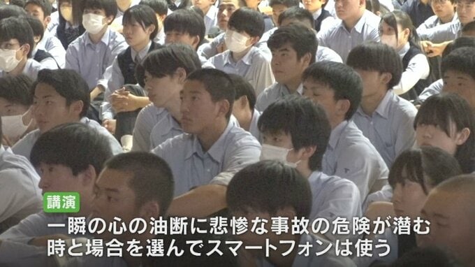 講演では、事故でへこんでしまった息子の水筒を生徒に見せ、一瞬の心の油断に悲惨な事故の危険が潜んでいることや、時と場合を選んでスマートフォンは使わなくてはならないことを生徒たちに語りかけました。