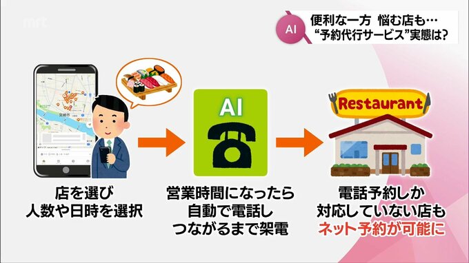 すると、AIが店の営業時間になったら自動で電話し、つながるまで架電して予約を代行してくれるというもので、これにより、電話での予約しか対応していない店でも、ネットで予約ができるようになる。