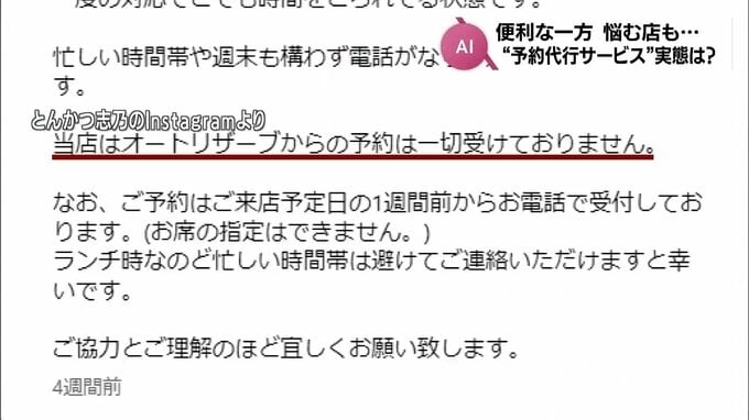 また、店では体調なども考えて予約を1週間先までしか受け付けていないが、「オートリザーブ」は、数か月先の予約まで受け付けてしまうこともあり、とんかつ志乃では「オートリザーブ」の予約は一切受け付けないとSNSに投稿した。