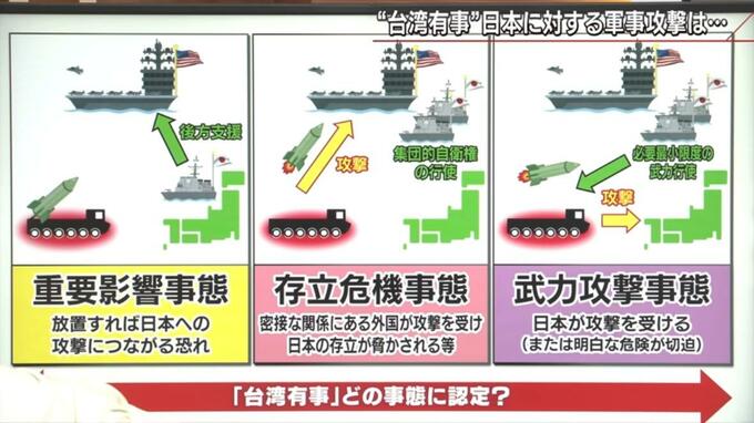「台湾のすぐそばは尖閣諸島、与那国島も石垣島も日本の領土ですから台湾が攻撃された時点で、存立危機事態や武力攻撃事態になりかねないかもしれない。」