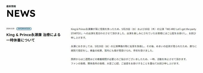 発表文によると「King & Prince永瀬廉が耳に怪我を負ったため、5月29日(水)および30日(木)の公演『WE ARE! Let's get the party STARTO!!』への出演を見合わせさせて頂きました。出演を楽しみにされていたお客様にはご心配をお掛けし、お詫び申し上げます。」と、記しています。