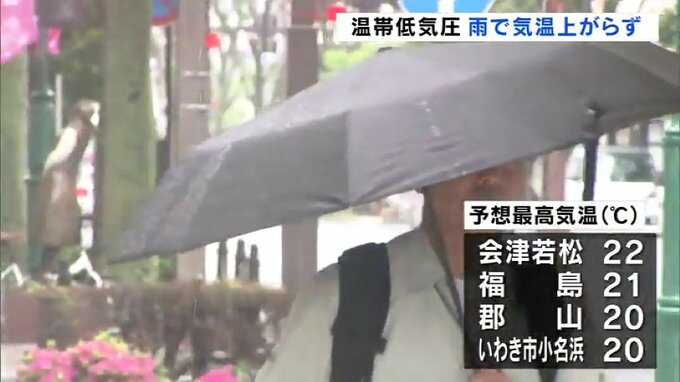31日の雨のピークは昼ごろになる見込みで、午後は次第に天気は回復する見込みです。予想最高気温は、会津若松で22℃、福島で21℃、郡山といわき市小名浜で20℃など、30日より5℃前後低くなる見込みで、福島地方気象台では体調管理に気を付けるよう呼び掛けています。