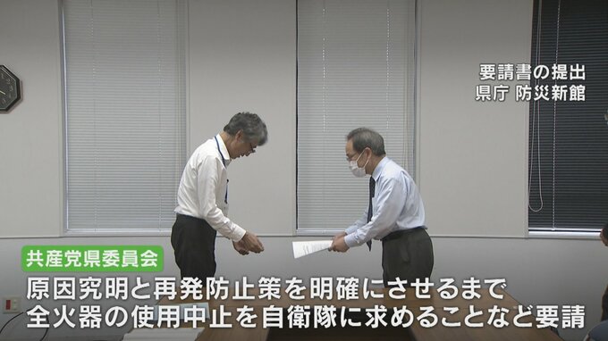 この事故を受けて共産党県委員会は31日、原因の究明と再発防止策が明確にされるまで全ての火器の使用中止を自衛隊に求めることなどを県に要請しました。
