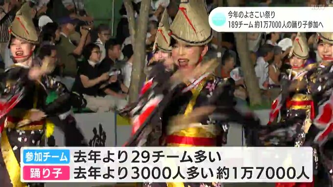 今年で71回目を迎えるよさこい祭りには高知県内から126チーム、県外63チームの合わせて189チームが参加する予定です。2023年より29チーム多く、踊り子の数は2023年より3000人多いおよそ1万7000人となっています。県内12チーム、県外9チームが初参加となります。