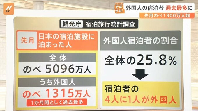 観光庁の「宿泊旅行統計調査」によりますと、4月に日本の宿泊施設に泊まった人は、全体でのべ5096万人でした。そのうち外国人がのべ1315万人となり、1か月間としては過去最多となりました。外国人宿泊者の割合でみると、全体の25.8%、宿泊者の4人に1人が外国人ということになります。