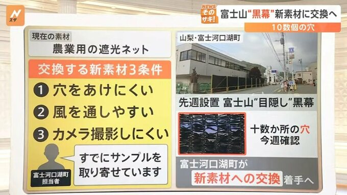 町の担当者によりますと、黒幕の素材は農業用の遮光ネットを使用していたそうです。今後は新素材への交換に着手するそうで、▼穴をあけにくい ▼風を通しやすい ▼カメラ撮影しにくいサンプルを取り寄せているといいます。