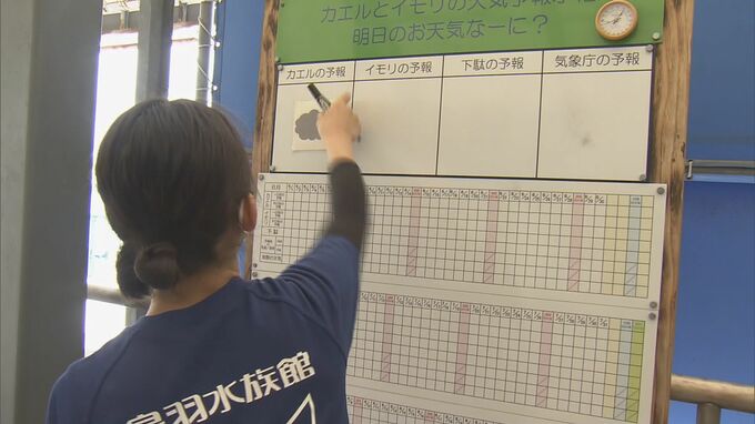 この天気予報は、カエルやイモリなどの両生類が湿度に敏感な性質を持っていることを生かし、三重県の鳥羽水族館で18年前から行われています。判定方法は、イモリが水中にいたら翌日の天気は晴れで、水から出てきたら雨となります。また、カエルは活発に動いていたら雨で、じっとしていたら晴れの予報となり、イモリとカエルの様子を観察した飼育員が掲示板に記録していきます。