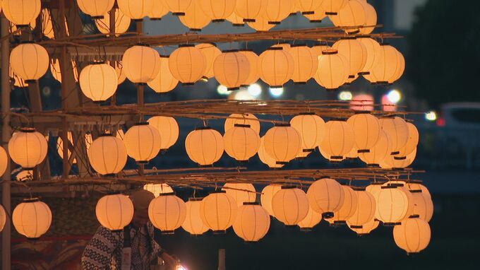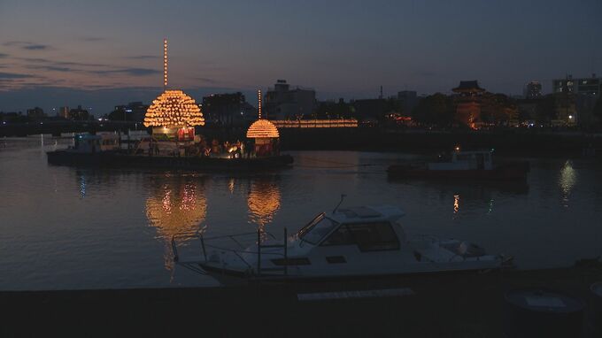 まつりでは、約360個のちょうちんに明かりを灯した「まきわら船」の曳き回しが行われ、水面に映ったちょうちんの明かりで幻想的な姿が浮かび上がりました。