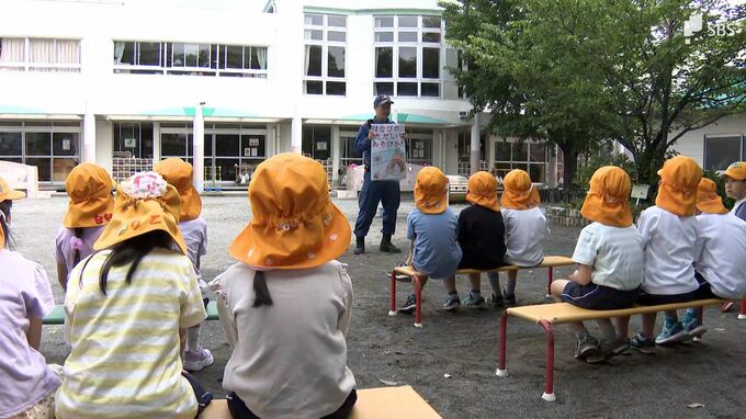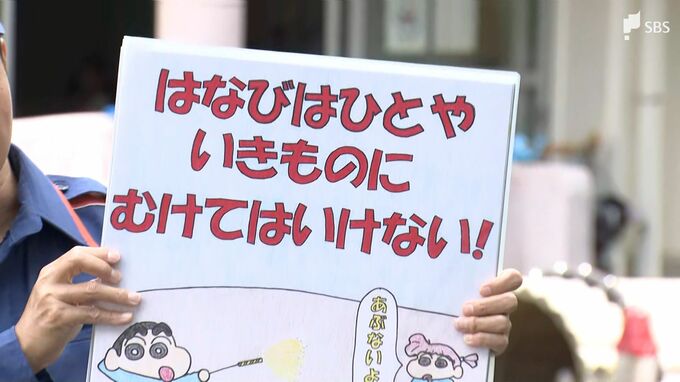 3日は、青島こども園の園児約60人が、花火を人に向けないことや、1本ずつ火をつけることなど、花火を楽しむときに気をつけることを学びました。
