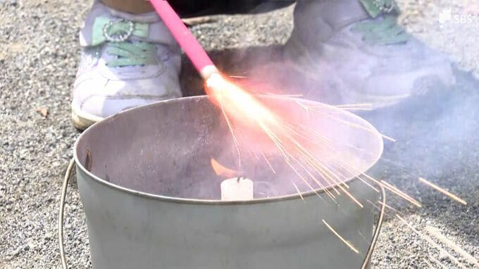 子どもたちは実際に火をつけて、花火の持ち方や水の入ったバケツに入れるまでの動作を体験しました。