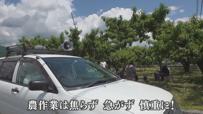 5月、山梨県笛吹市のモモの畑で農作業中の死亡事故が相次ぎ、峡東地域で広報車を使って安全な農作業をよびかける活動が始まりました。