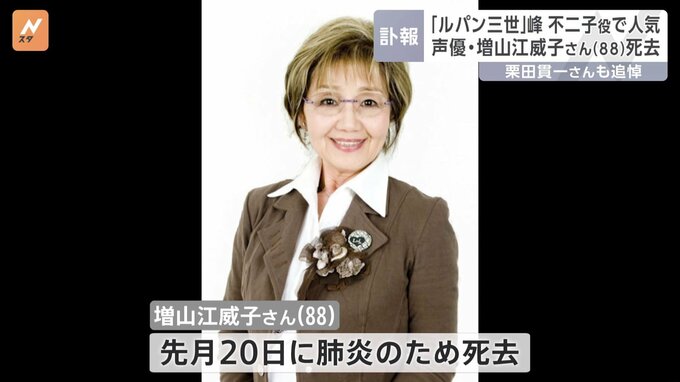 人気アニメ「ルパン三世」の峰不二子役などで知られる声優の増山江威子さんが亡くなりました。所属事務所によりますと、声優の増山江威子さんが先月20日に肺炎のため亡くなりました。88歳でした。増山さんは東京都…