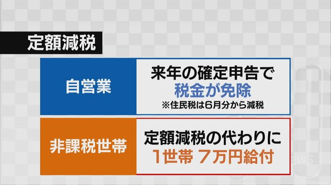 また自営業の場合は、所得税分は来年の確定申告で税金が免除されます。非課税世帯の人は対象外ですが、1世帯7万円が給付されます。