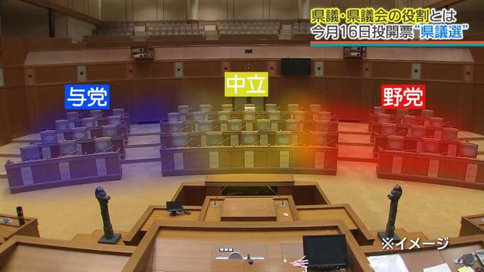 中で簡単な受付をすれば議会を傍聴することができます。議場内は議長席を中心に48議席が、「会派」と呼ばれるグループごとに分かれて座っています。議長席からみて左側が県政与党(基本的に知事の県政方針に同調し支える側)、右側が野党(基本的に知事の県政方針と対立し批判的にみる側)、となっています。