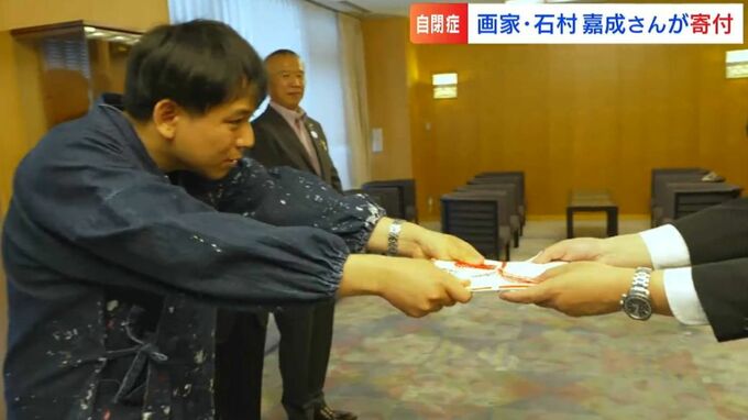 自閉症の画家・石村嘉成さんらが岡山県庁を訪れ、障害がある人を支援する基金に寄附金を贈りました。「失礼します。石村嘉成です。」石村嘉成さんらが岡山県庁を訪れ、上坊副知事に寄附金を贈りました。寄附は、障…