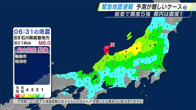 6月3日朝、石川県能登地方で、最大震度5強を観測した地震では、静岡県にも「緊急地震速報」が発表されました。静岡県内での実際の揺れは、最大で震度1でしたが、予測が難しいケースもあると気象庁は説明しています。