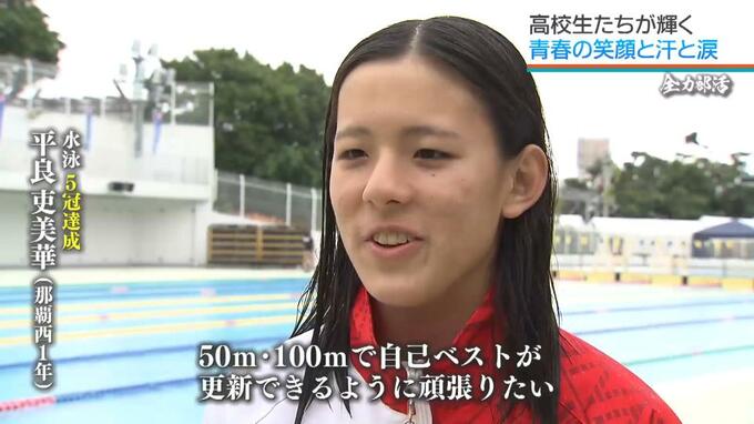 女子自由形100m決勝は、那覇西高1年・平良吏美華。2023年、年齢別のアジア選手権で2冠を果たした実力者が、1年生ながら序盤からリードし自由形100mを制したほか、個人種目やリレーを合わせ、5冠を達成した。