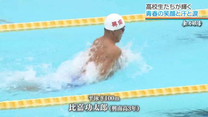 県高校総体、水泳では10種目で大会新記録が飛び出した。男子平泳ぎ100m決勝は、興南高3年の比嘉功太郎が自身の持つ県記録を更新する1分02秒83をマークし、200mと合わせて2冠を達成。