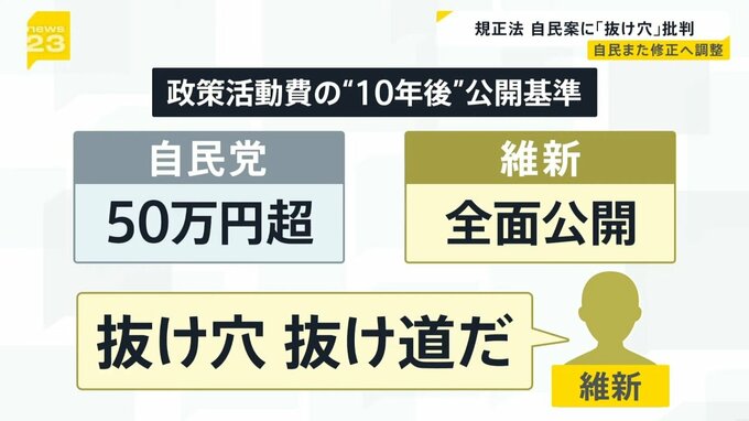 自民党と維新は10年後に政策活動費の使途を公開する方針で一致していましたが、自民党が「数千万円単位の支出が多い」として、公開対象を「50万円超の支出」としたことに維新が「抜け穴」「抜け道」だと強く反発。「全ての領収書を公開すべきだ」と主張しています。