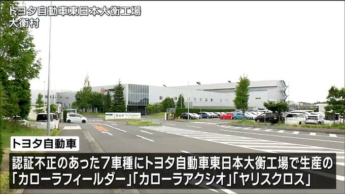 トヨタ自動車によりますと今回、不正が発覚した7車種に、大衡村にあるトヨタ自動車東日本大衡工場で生産されている「カローラフィールダー」「カローラアクシオ」「ヤリスクロス」の3車種が含まれています。これらの車種では、自動車の生産に必要な型式指定の認証試験で虚偽のデータを提出していたほか、車両に不正な加工をしていたということです。これを受けて大衡工場では、カローラフィールダーなど3車種については6日から30日まで生産を停止することになりました。その間に、改めて国の型式指定の認証が得られれば、生産を再開する方針です。