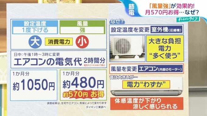 【風量を強にした場合】の方が体感温度も下がり、かつ節電になるという結果になりました。