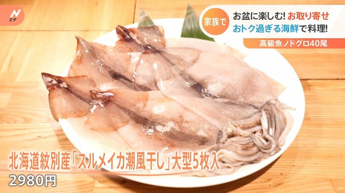 1枚1000円もする大きな「北海道紋別産 スルメイカ潮風干し」は5枚で2980円。