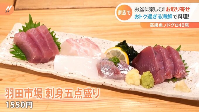 マグロ、カツオ、タイなどその日一番の5種類がのった「羽田市場 刺身五点盛り」(1550円)や、大ぶりの「特大サイズ さばの塩焼き」(980円)など、味自慢の海の幸が勢ぞろい。