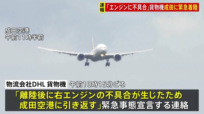 午前10時15分ごろ、成田空港を離陸した貨物機から「機体のエンジンに不具合があり、引き返す」と緊急事態を宣言する連絡がありました。貨物機はつい先ほど、成田空港に緊急着陸しました。午前10時15分ごろ、成田空…
