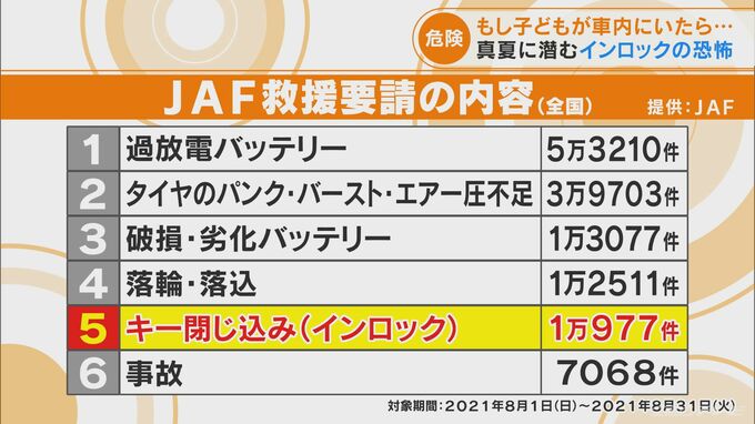 JAFによりますと、去年8月の1か月間で救援要請の理由として、5番目に多かったのが「インロック」。さらにそのうち、子どもやペットが車内に取り残されてしまったケースはあわせて99件(子ども63件ペット36件)にのぼります。