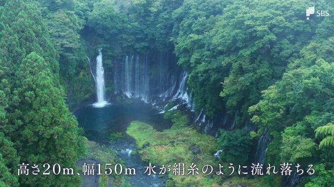 ・幅150mの湾曲した岩壁の間から白い絹糸のように流れるさまは、白糸の滝の名にふさわしい絶景・年間を通して水温約12℃、毎秒1.5トンの湧水はほとんどが富士山の伏流水で、周囲にきりりと冷えた風を運んでくれる…